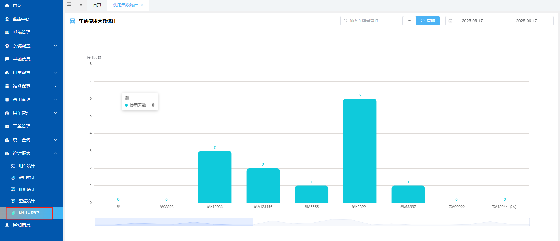 对于远距离行驶的车辆,如:旅游包车,需要单独统计用车天数,可在【使用天数统计】中车辆在一段时间的使用天数情况。