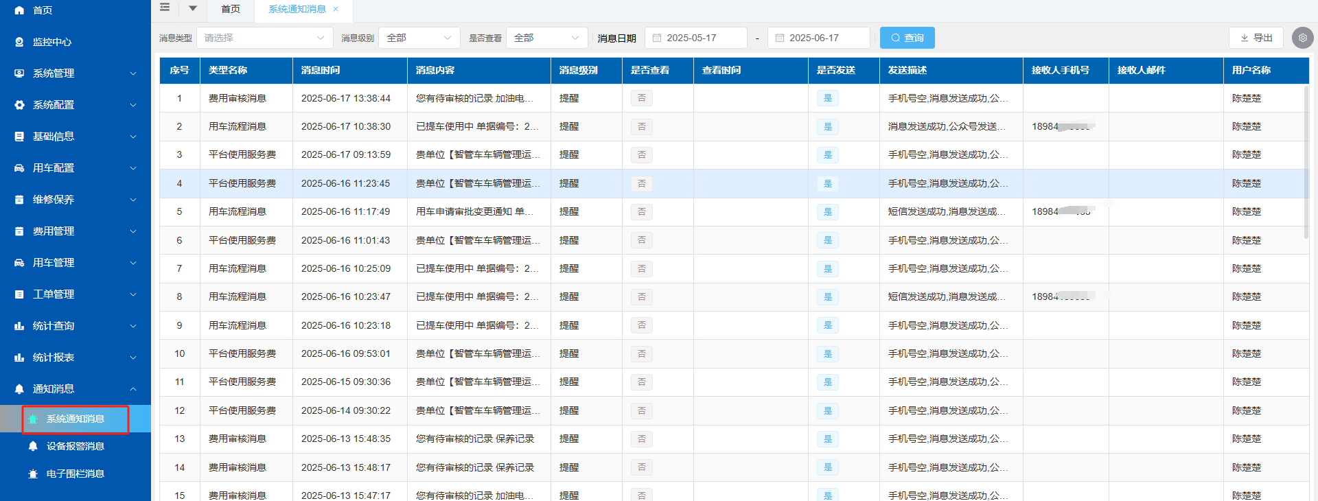 【用车通知消息】可查询用车申请流程中节点中的消息通知、维保信息到期提醒、流量到期提醒、平台服务到期提醒。