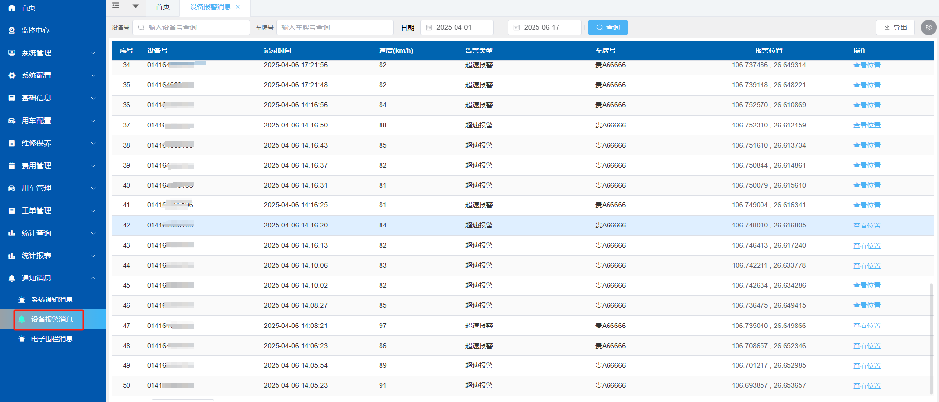 如安装了GPS设备,可在此查询GPS超速、掉电等提醒,超速提醒通知需先在【GPS设备查看】中设置。