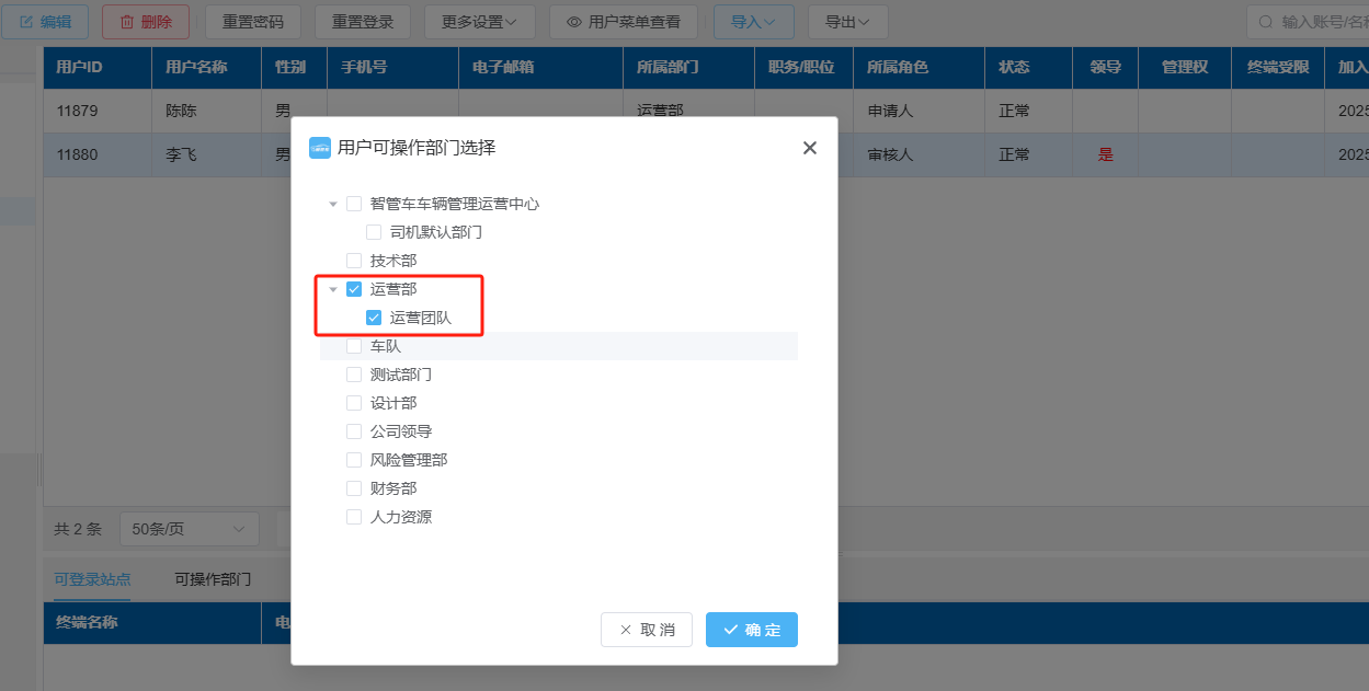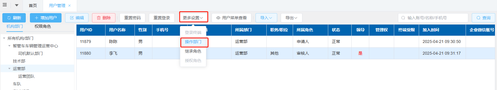 如部门领导存在兼职其他部门或管理子部门的情况,可选中用户,点击上方的【更多设置】-操作部门,勾选需要管理的部门或子部门,在用车申请流程里面设置由部门领导审批之后,子部门或兼职部门人员发起的用车申请,就会转发到设置的部门领导进行审批了。