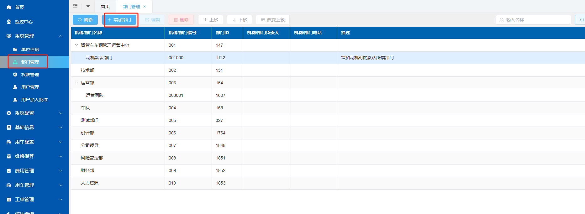 左侧菜单选择【部门管理】,点击上方的“新增部门”按钮,在弹出框中依次填写部门名称,部门负责人、部门电话可非必填项,可根据需要进行填写。