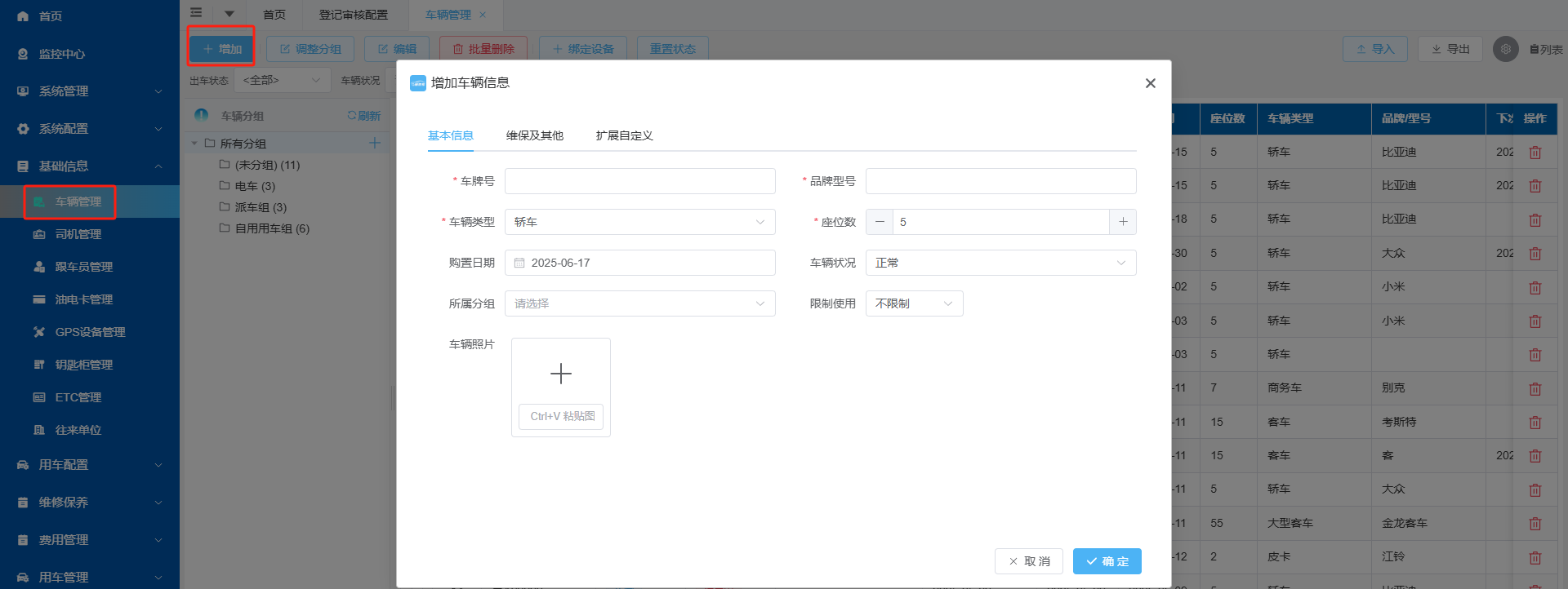 -【车辆管理】菜单进入页面,点击上方的“增加”按钮添加车辆信息,依次录
