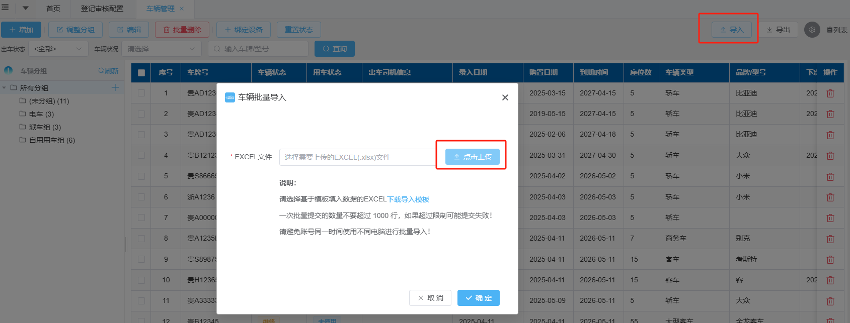 3、点击弹出框中的“点击上传”按钮,选择刚才保存的车辆导入文件上传点击“确定”按钮即可导入车辆;