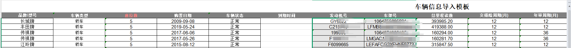 2、在导入模板中填写好车辆信息,红色为必填项,保存到本地;