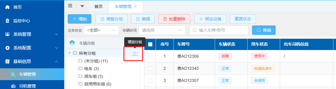 1、车辆数较多的情况下,可在左侧添加分组,点击所有分组旁边的“+”号按钮,添加分组;