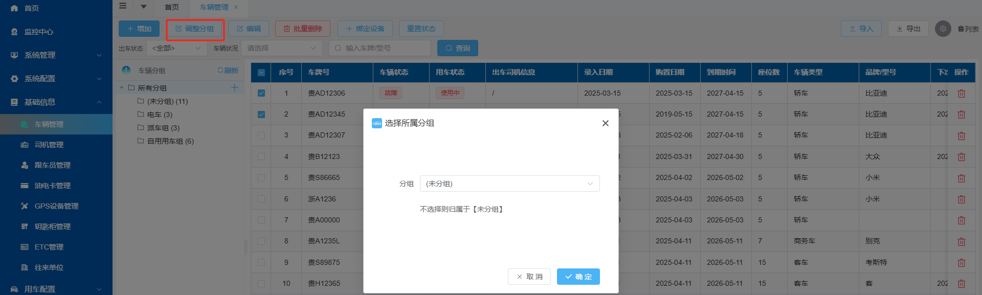 2、将车辆展示切换为列表模式,勾选需要分组的车辆,点击上方的“调整分组”,选择车辆所有分组,点击“确定”按钮保存;
