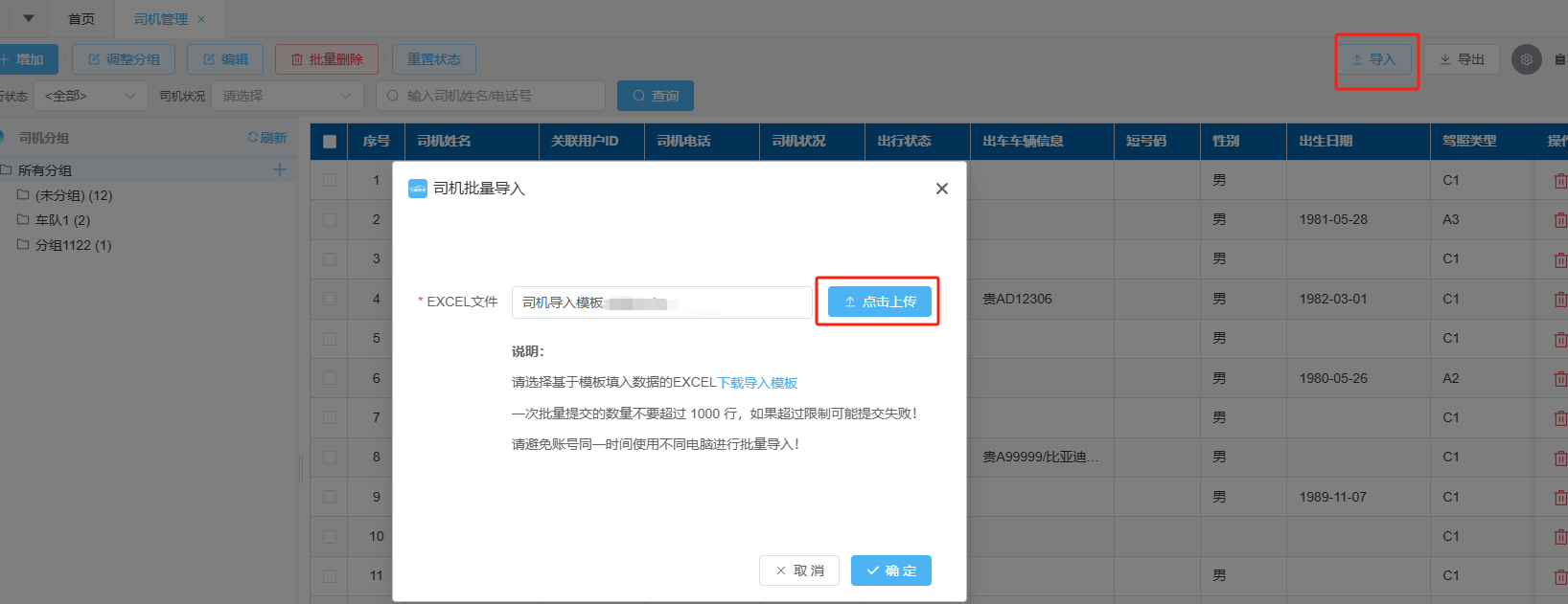 3、点击弹出框中的“点击上传”按钮,选择刚才保存的司机导入文件上传点击“确定”按钮即可导入司机;