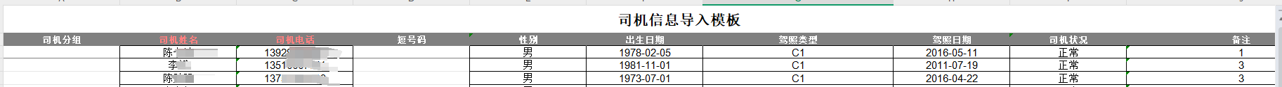 2、在导入模板中填写好司机信息,红色为必填项,保存到本地;