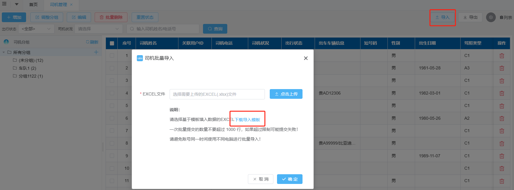 1、如司机信息较多,也可以点击上方的“导入”按钮,下载导入模板进行导入;