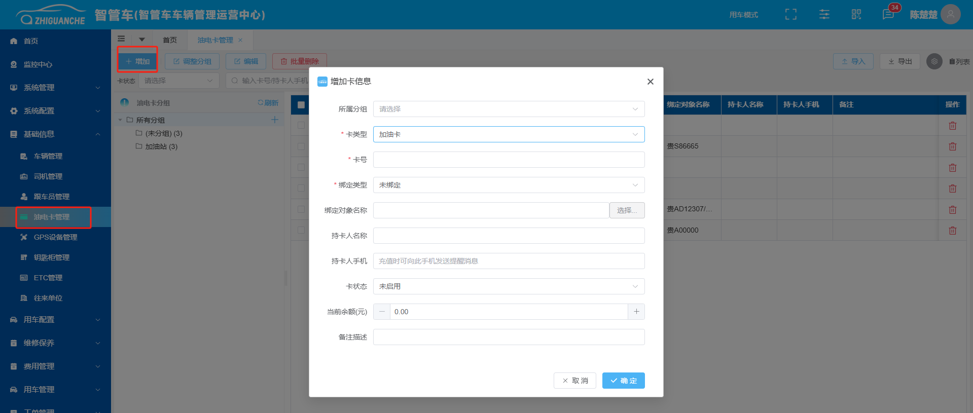 点击左侧菜单中的【油卡管理】菜单,点击按钮栏的增加按钮,在录入界面选择分组、油卡类型、卡号信息如油卡绑定了车辆、司机或部门,可以选择绑定类型,再选择下方的绑定对象进行绑定,输入持卡人手机号之后,充值油卡时会进行短信提醒(需充值短信服务),全部数据填写完绋后点击【确定】按钮保存。