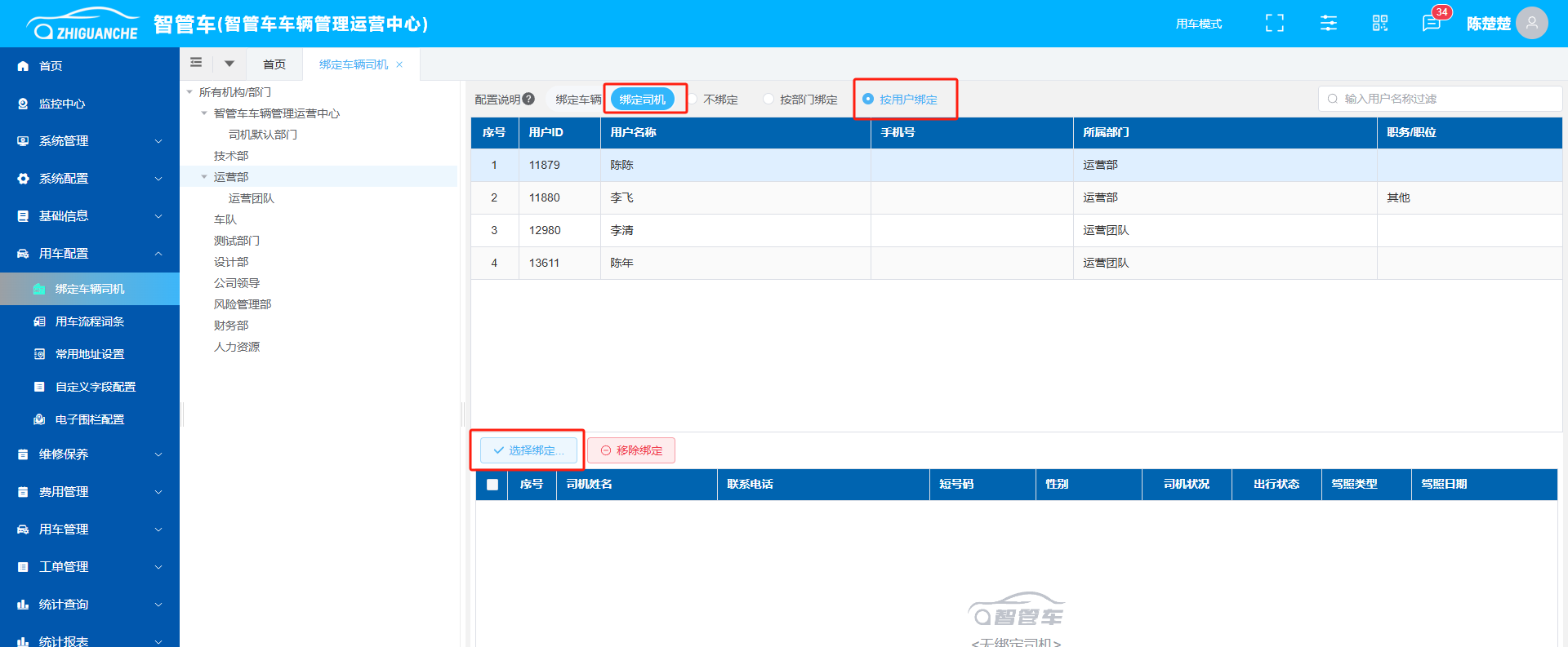 “绑定车辆”并勾选“按用户绑定”按钮,上方选择用户,下方点击“选择绑定”按钮,在弹出框中选择部门需要绑定的车辆返回界面即可;