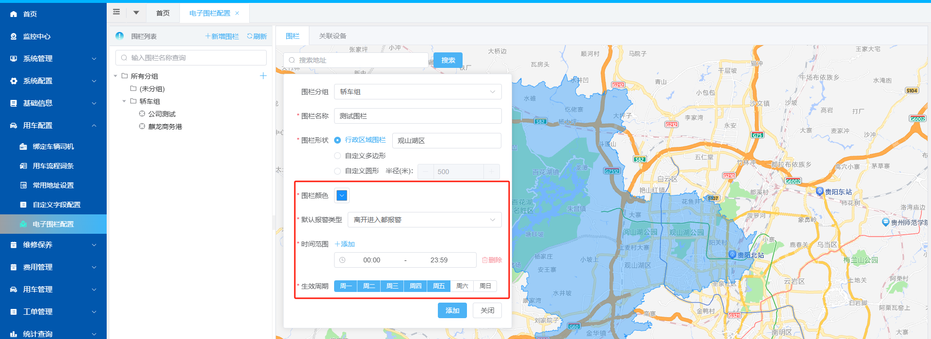 2、依次选择围栏颜色,报警类型,添加出入围栏的时间范围(可添加多段时间范围),再设置生效周期,并点击“添加”按钮进行保存。 如选择周一-周五,则在进出此区域时,在周一至周五的设置时间段会发送报警通知并提醒管理员。