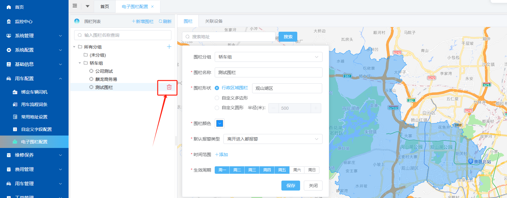 3、如需要删除围栏,可以在左侧列表中选择围栏名称,则会显示删除按钮,点击删除按钮进行删除即可。