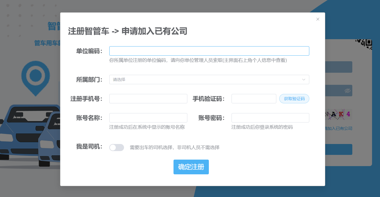 2、依次填写单位编码(管理员登录平台,在【系统管理】-【单位管理】-“单位信息”中查看),选择你所在的部门,填写手机号、帐号名称、帐号密码,点击发送验证码填写验证码注册,如果是司机,需要勾选“我是司机”选项。