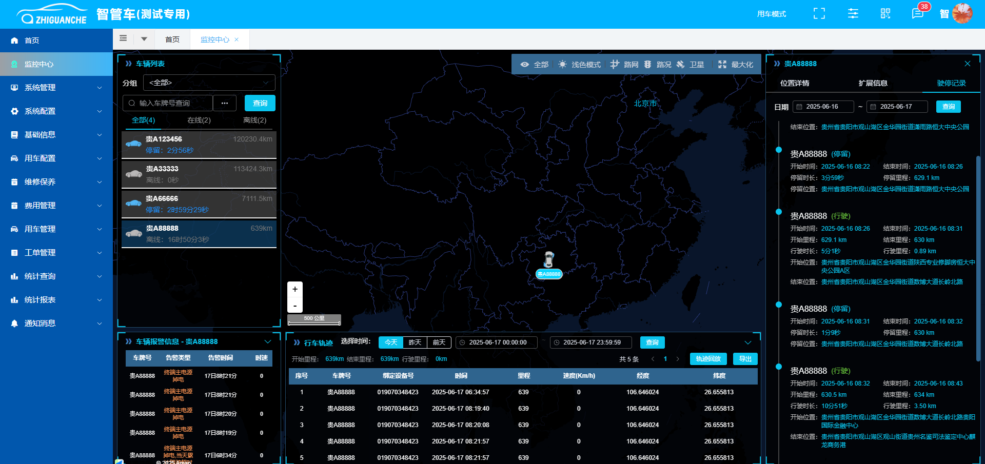 菜单中的【监控中心】菜单,可实时查看所有车辆的当前位置,可对指定车辆的轨迹进行回放,显示行驶路线及停留点