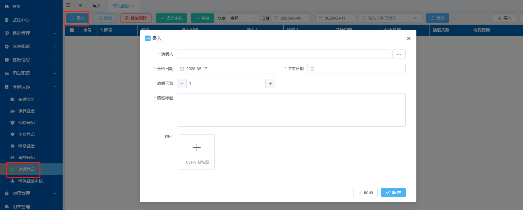 【请假登记】中可提交请假申请,管理员帐号可在此查看员工提交的请假申请,并进行审核存档操作。