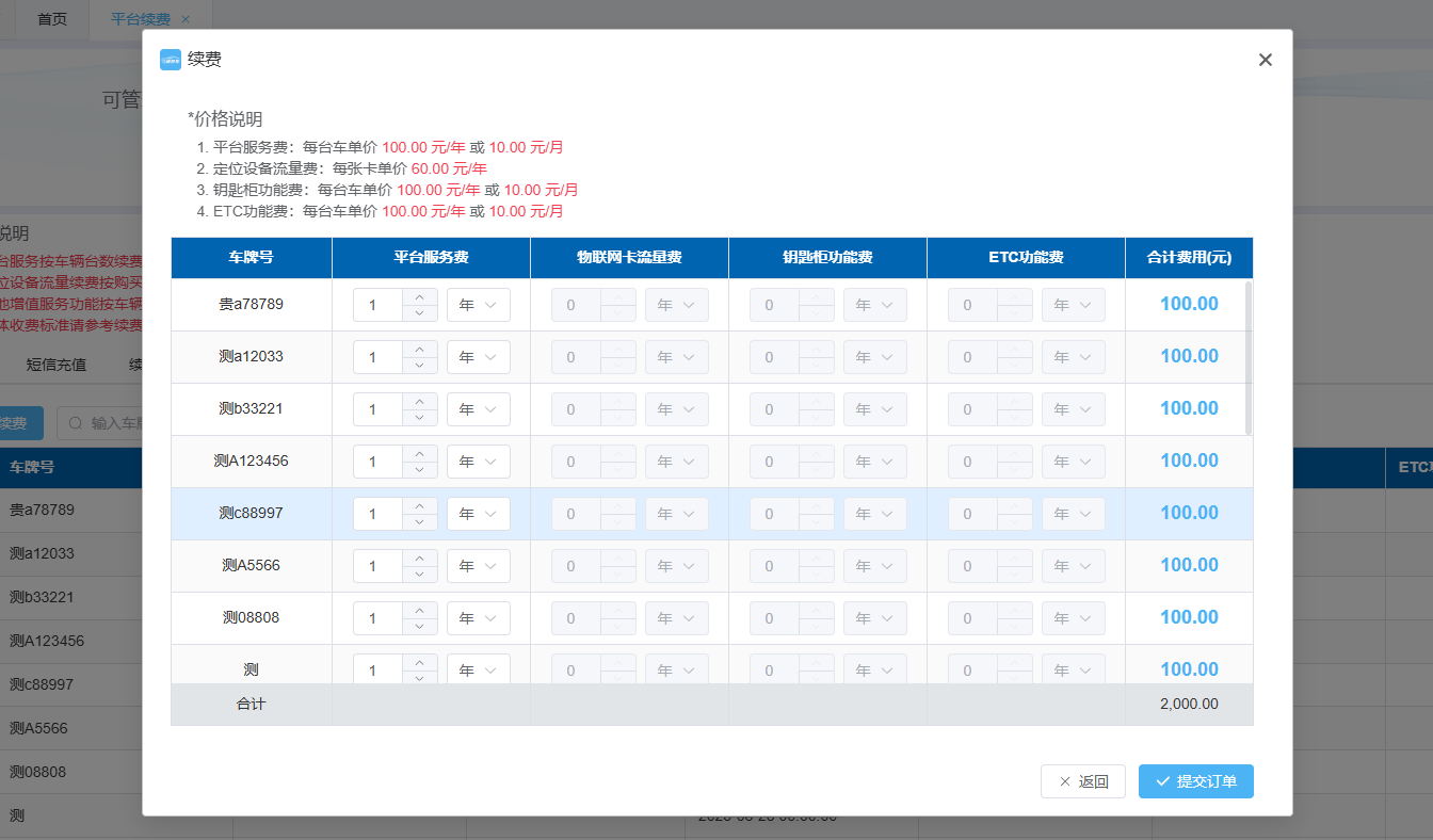在弹出框中,对需要续费的项目进行续费,平台服务费、钥匙柜功能费、ETC功能费可选择年或月进行续费,流量费由运营商收取,只能按年续费,核对续费详情,确认无误后点击下方的“提交订单”按钮;