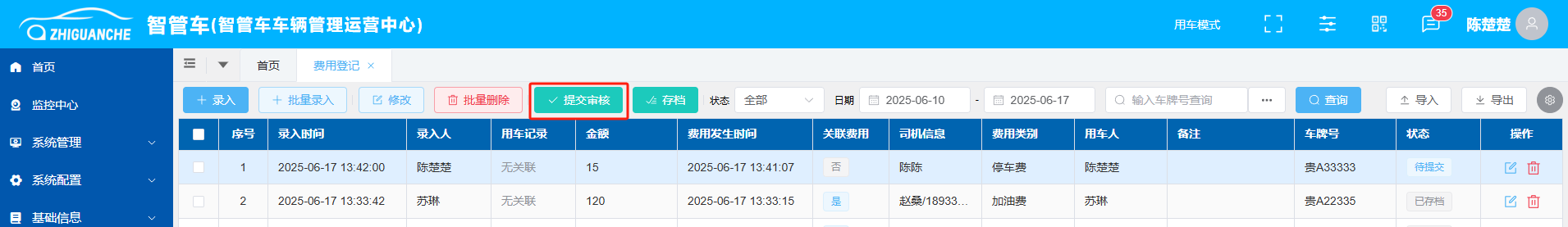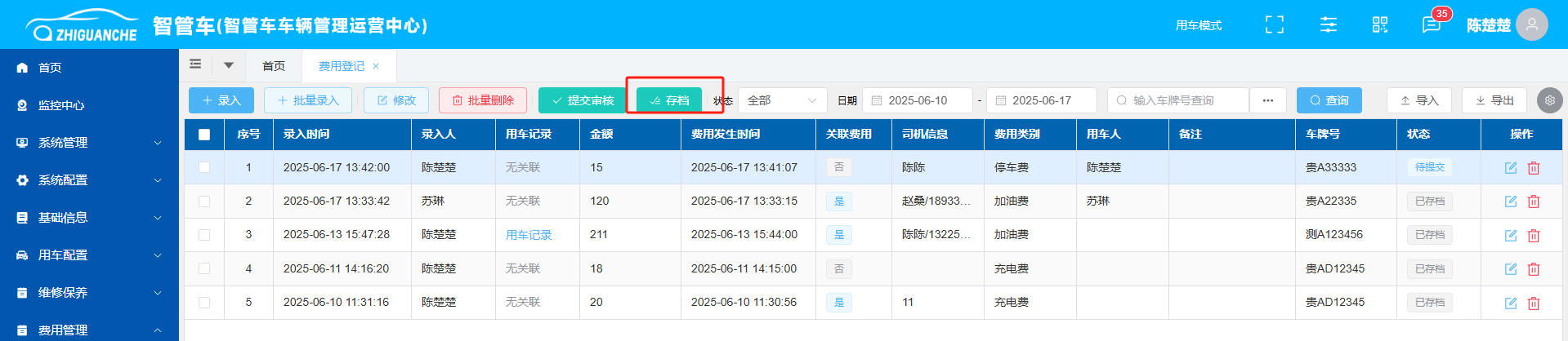 2、费用添加完比后,可在列表界面选中指定记录后“提交审核”或“存档”,存档后数据汇总到费用统计中