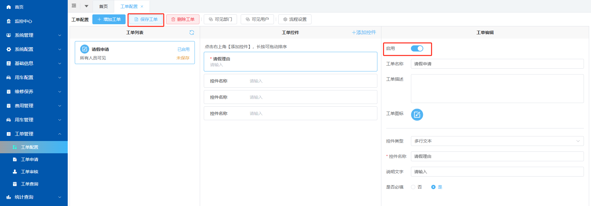 2、全部控件添加完之后,点击“保存工单”按钮保存。