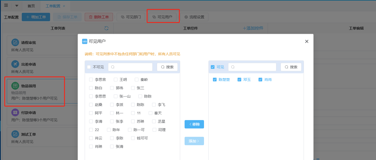 6、工单还可以设置可见部门和可见用户,左侧列表选中某一工单,点击上方的“可见部门”或“可见用户”。