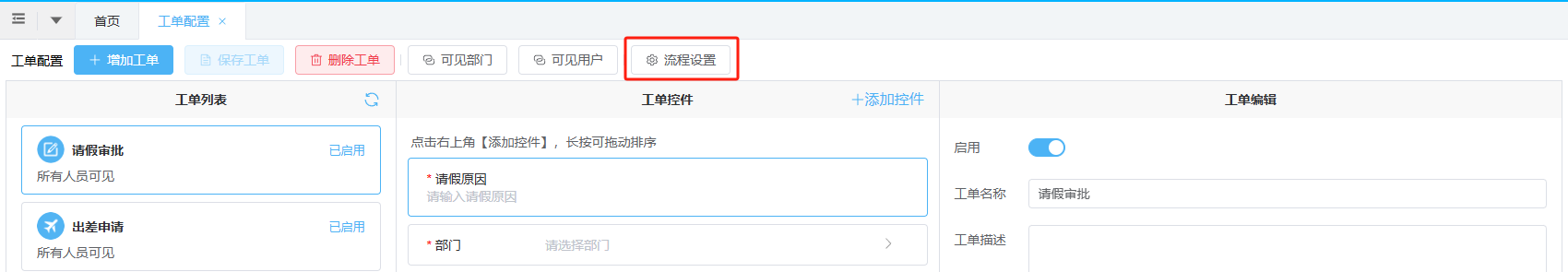 3、在工单列表选择工单,点击上方的“流程设置”,为工单配置审批流程。