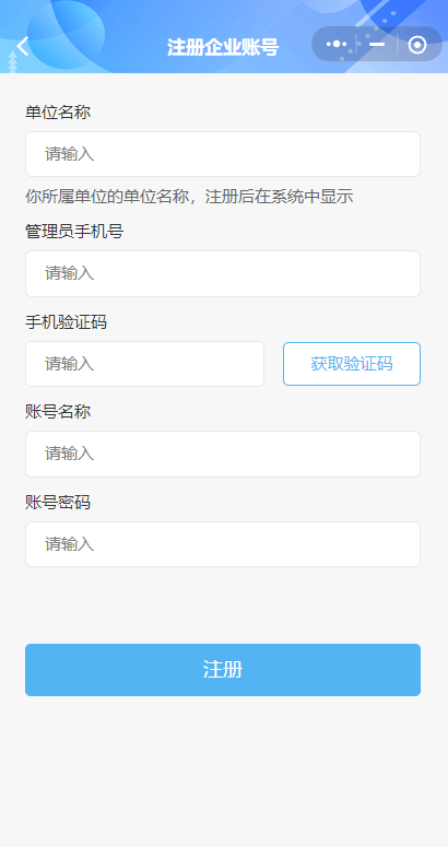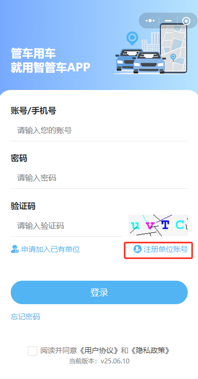 打开应用市场App,搜索“智管车”下载安装;也可以在微信搜索“智管车”进入小程序界面注册帐号。安装智管车APP打开或进入小程序界面后,在登录界面选择右下方“注册单位帐号”,填写公司信息再点击“注册”即可。