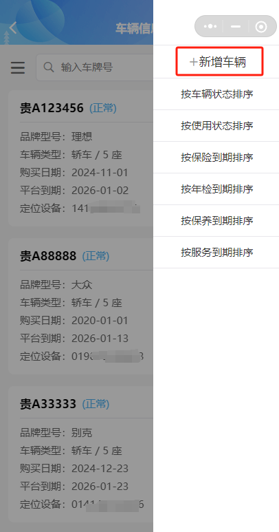 ”按钮,点击“新增车辆”,输入车辆信息点击"完成",车辆信息中还可修改车辆信息和查看车辆状态;