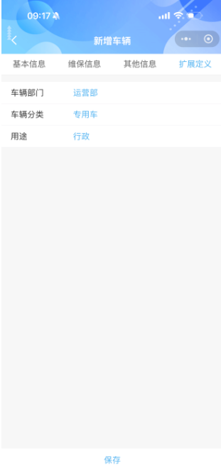 扩展信息中可填写在自定义字段中增加的车辆信息标签,此信息请管理员前往电脑端【自定义字段配置】-【车辆信息】中配置。