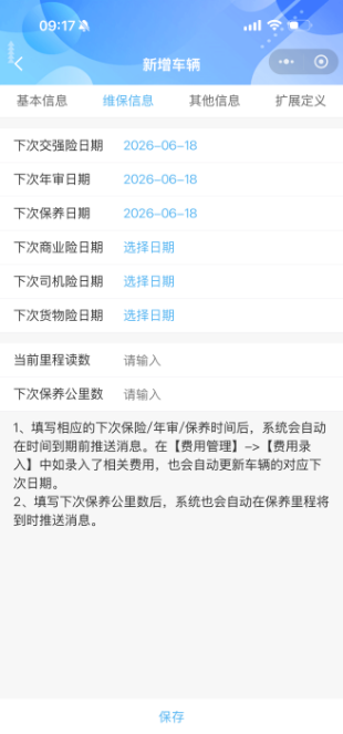 在【维保信息】页签中提供维保信息的录入,如完整填写后,系统会自动在保险/年审/保养时间到期前自动推送消息给管理员。后期在【台账记录】中如录入了保险/年审/保养费 用,则会自动更新车辆的对应保养信息。