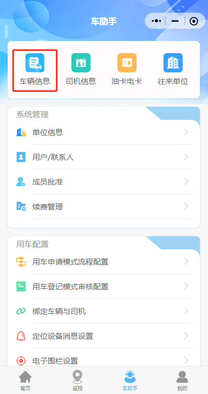 点击首页底部菜单栏【车助手】选择【车辆信息】界面点击右上角“