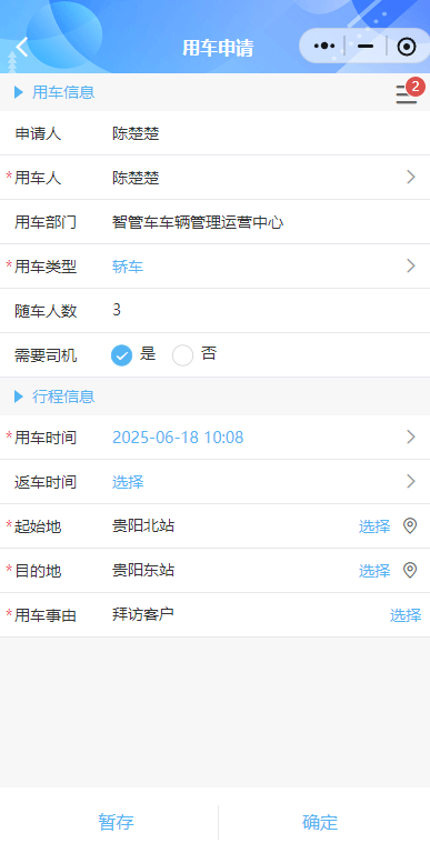 用车人登录移动端,点击【用车申请】填写用车信息和行程信息,提交用车申请。如需要增加用车自定义字段,可在电脑端【用车配置】-【用车自定义字段】中添加。