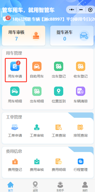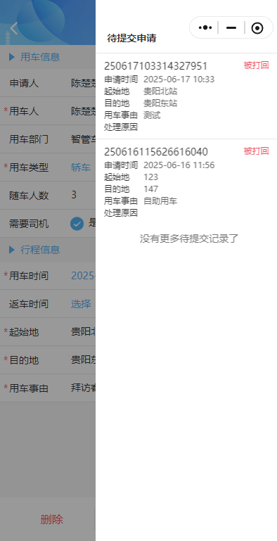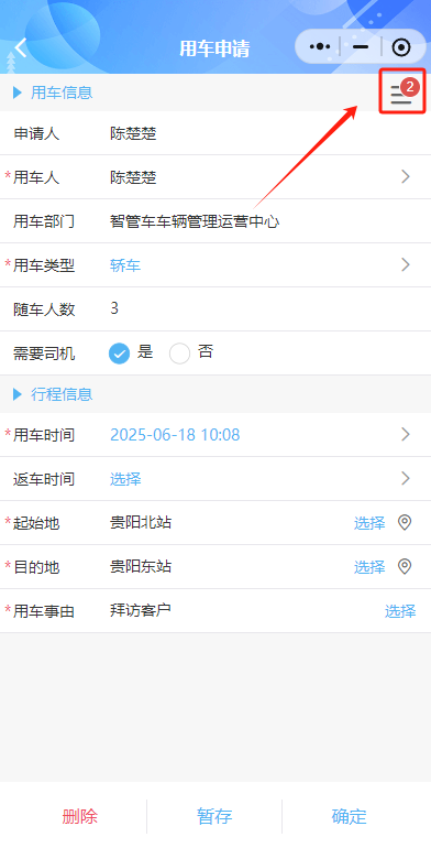 “暂存”的用车申请和“被打回”的用车申请,在用车申请显示消息红色小气泡,可进入用车申请界面,点击右上角图标,更改用车申请或删除用车申请。