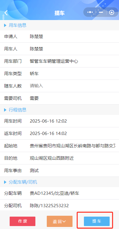 管理员审核后由司机/用车人/申请人或指定人进行提车与还车操作,点击首页【提车还车】菜单进入页面进行提车/还车,点击下方“提车”、“还车”操作按钮即可完成提车/还车操作,