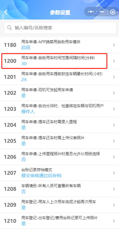 为了避免自助用车预约时间产生冲突,前后两段预约用车,需要保留一定间隔时间,避免提车返车时间到了前一用户没有操作还车,导致后面用户提不了车的情况。管理员可在【车助手】-【系统参数设置】-1200参数设置自助用车时间范围间隔,如间隔设置为30分钟,在预约同一车辆的情况下,前面已有用户预约同时段或在同时段前后(用车时间、返车时间)30分钟内,都不可再进行预约。