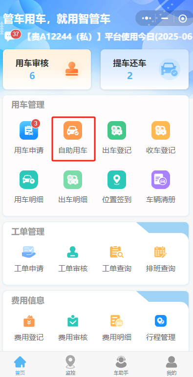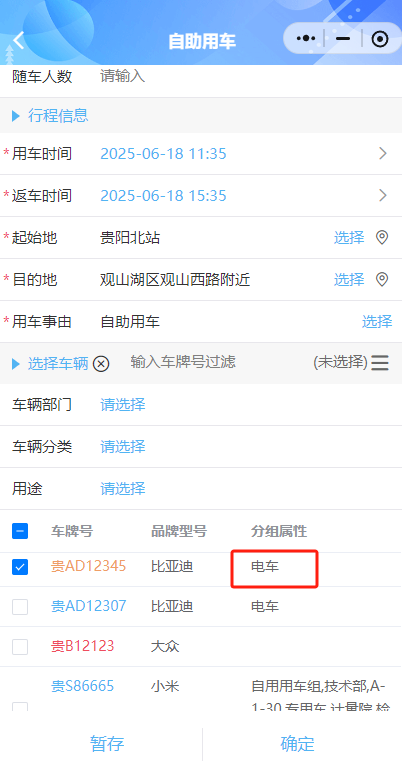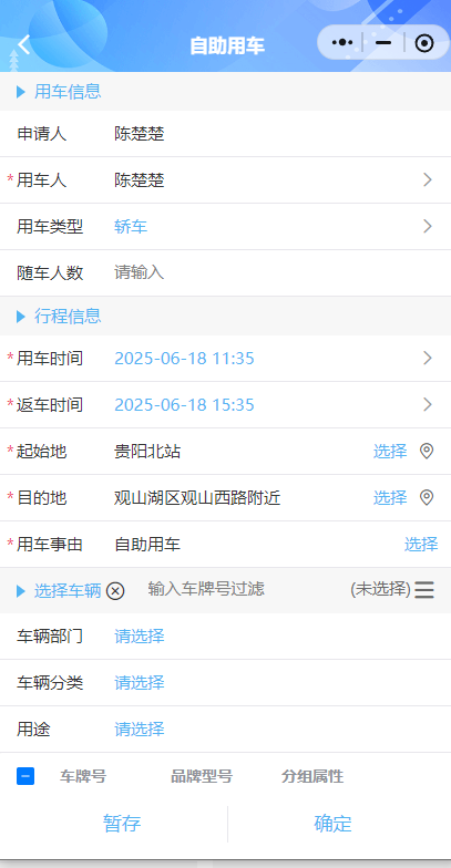 用车人登录移动端,点击【自助用车】填写用车信息和行程信息,系统会根据选择的用车类型、随行人数自动判断并显示选择范围内可用的车辆,在“选择车辆”时可以输入车牌号、选择分组、分组标签快速查询自己想要的车辆,蓝色字体标注的车辆代表“未使用”,橙色字体标注的车辆代表车辆正在“预约审批中”,红色字体标注代表车辆在“使用中:。