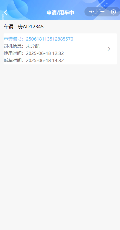 点击下方的分组类型标签,可以查询车辆的用车时段,方便错开时间预约车辆。管理员用户点击申请编号还可以查询用车详情。