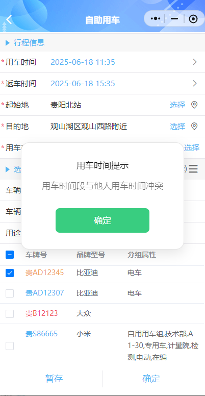 如用车时间有冲突,则系统会提示与他人预约时间有冲突,需要选择另外的时段再进行预约用车。