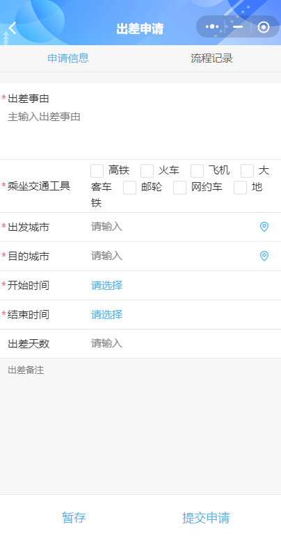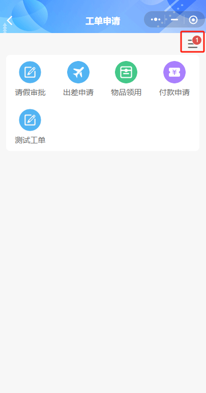 【工单申请】中可查看已配置好并启用的工单,如第一次使用,未添加工单,管理员可通过电脑端【工单管理】-【工单配置】中按单位实际情况配置工单,配置完成之后,单位人员可点击相应的工单发起申请。暂存的工单和被打回的工单,都可点击右上角红色小汽泡图标进行查看。