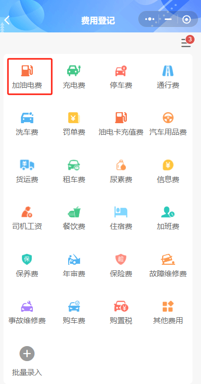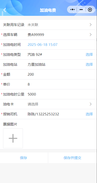 首页点击【费用登记】进入页面,选择需要填写的费用,如“加油费”,进入编辑页面,可选择“关联用车记录”,依次选择车辆、时间、加油类型、金额、油料单价、加油时公里数、票据图片等信息点击“保存”或“保存并提交”,点击“保存”后,可点击红色数字小汽泡,可再编辑,也可以进行“删除”、“提交审核”,点击“保存并提交”则表示确认无误提交给管理员进行审核。