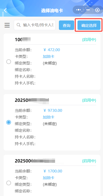 使用油卡的单位,填写加油电费时,如需要扣除油卡余额,需要在加油卡一栏选择相应加油卡号,存档后将会减去油卡余额。