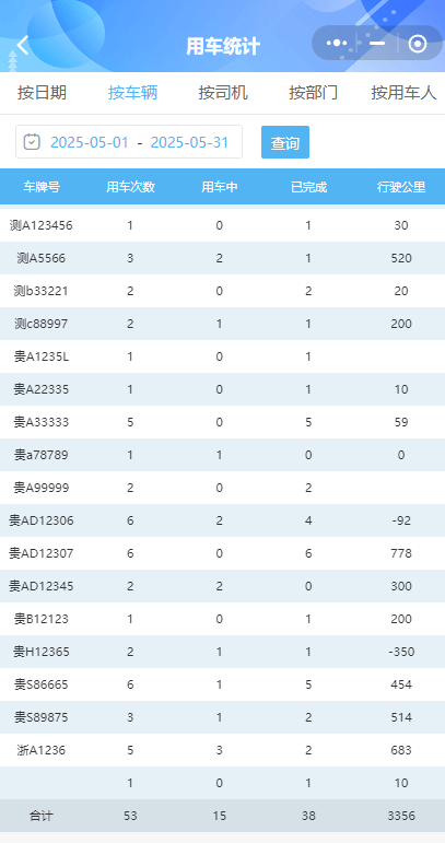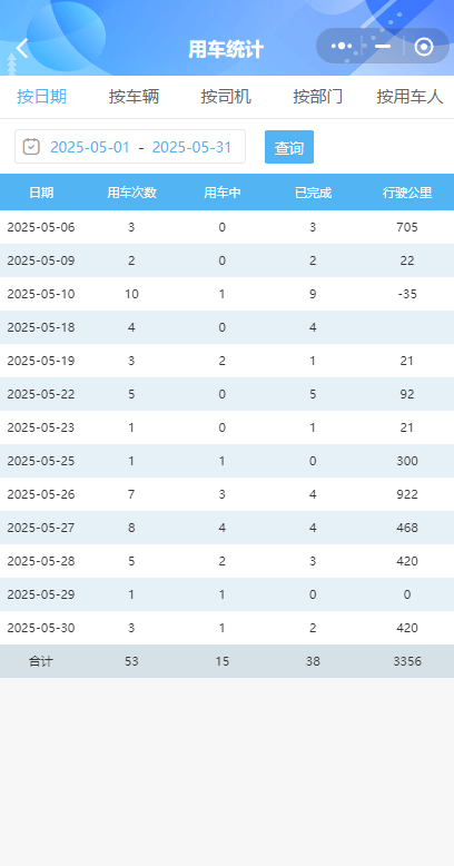 从首页点击【用车统计】进入页面,可按日期、按车辆、按司机、按部门、按用车人查看用车辆使用情况,可筛选日期进行查询。