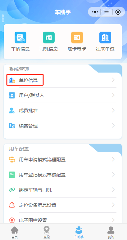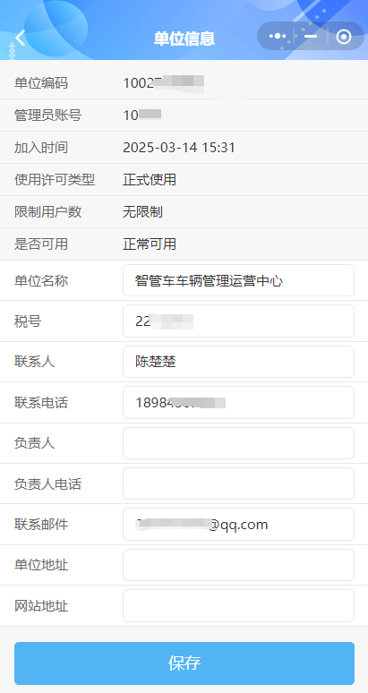 从车助手点击【单位信息】进入页面,可查看单位编码、使用天数等,可更改单位名称、税号、联系人、邮件信息。