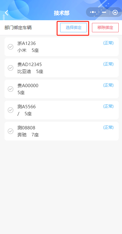 点击首页底部菜单栏【车助手】,选择【绑定车辆和司机】进入。如单位人员较多,推荐按部门进行绑定。选择绑定车辆。勾选“按部门绑定”,在下方选择部门进入页面,点击“选择绑定”按钮,勾选部门可用的车辆返回(可选择一台或多台车辆进行绑定),车辆选中后将在列表进行展示。