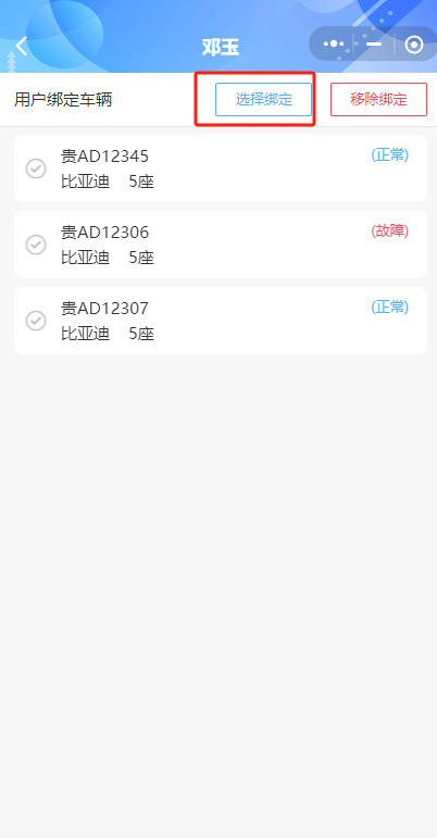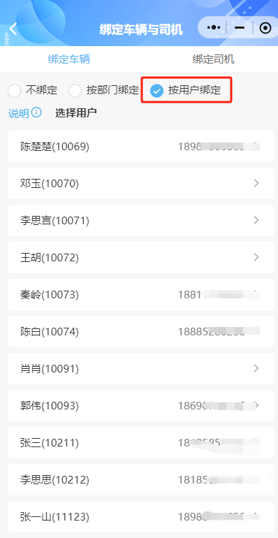 选择绑定车辆。勾选“按用户绑定”,在下方选择某一用户进入页面,点击“选择绑定” 按钮,勾选用户可用的车辆返回(可选择一台或多台车辆进行绑定),车辆选中后将在列表进行展示。