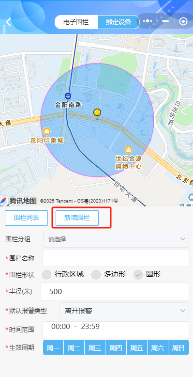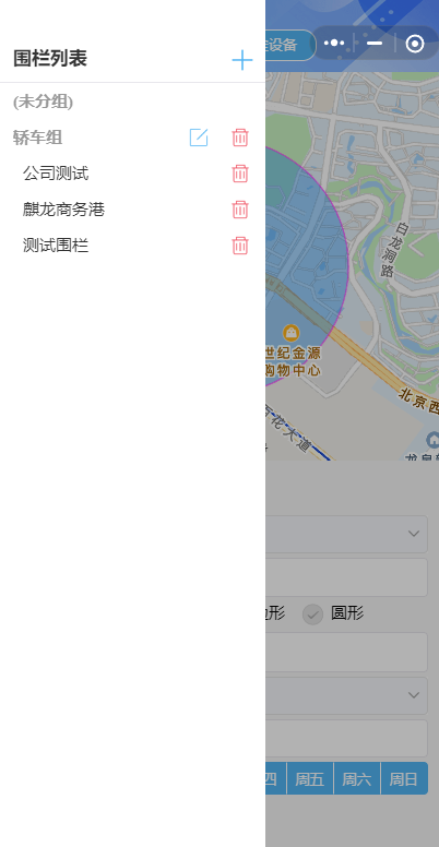 点击“新增围栏”,填写围栏名称,选择围栏形状为“圆形”,设置半径和报警类型,再选择时间范围,和生效周期,点击右上角“保存”按钮保存。点击“围栏列表”可查看围栏分组。